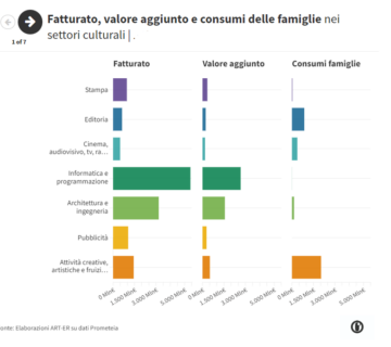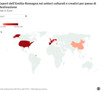 Le seguenti datavisualization mostrano il volume di affari generato da attività di esportazione e i settori ICC più coinvolti, le province dell’Emilia-Romagna interessate dall’export e in che misura, una comparazione tra gli anni ... leggi di più